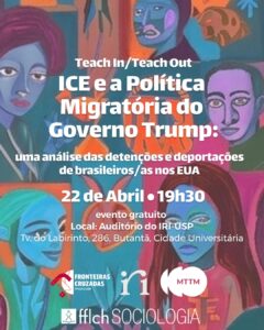 O evento gratuito é organizado pelo Fórum Fronteiras Cruzadas, vinculado ao Programa de Pós-Graduação em Sociologia da USP, em parceria com o IRI-USP e os grupos de pesquisa “Cidade e Trabalho” e “Mobilidades: Teorias, Temas e Métodos”. Ainda, integra as atividades “teach-in, teach-out” articuladas com a Migration Scholars Mobilize Network (Rede Global de Solidariedade e Resistência de Estudiosxs da Migração).