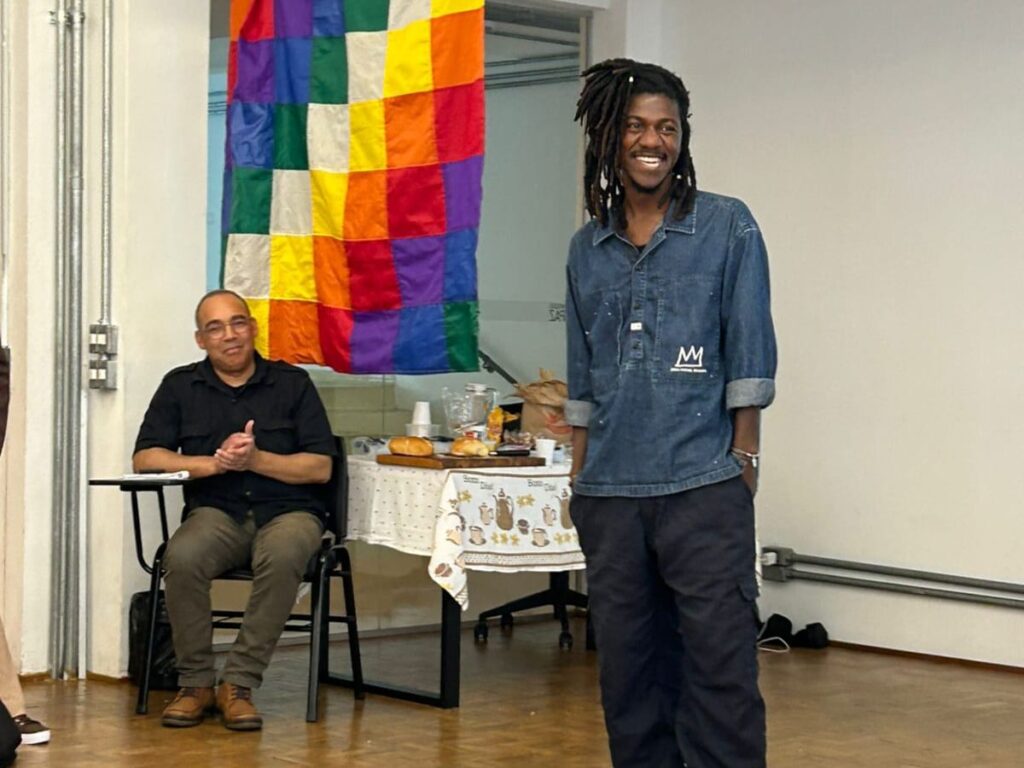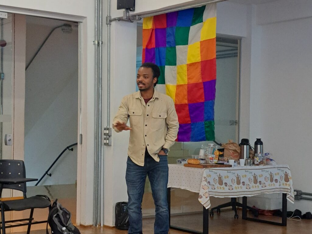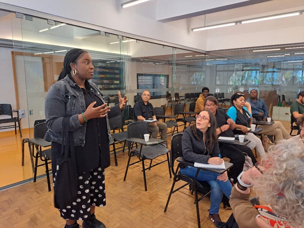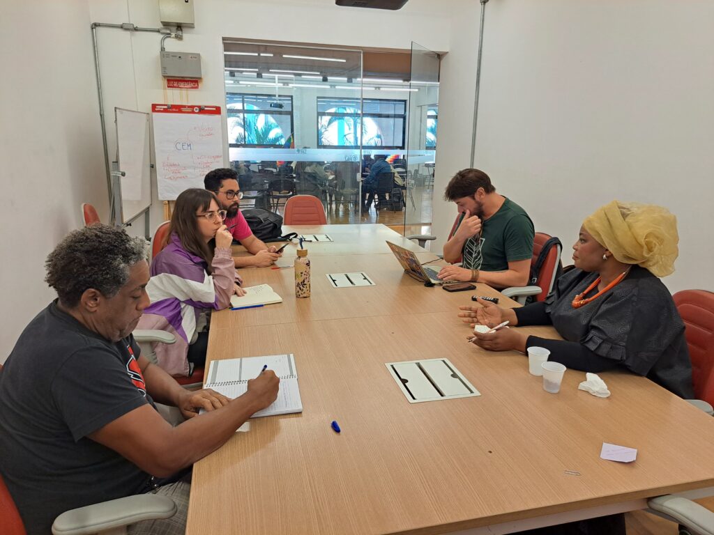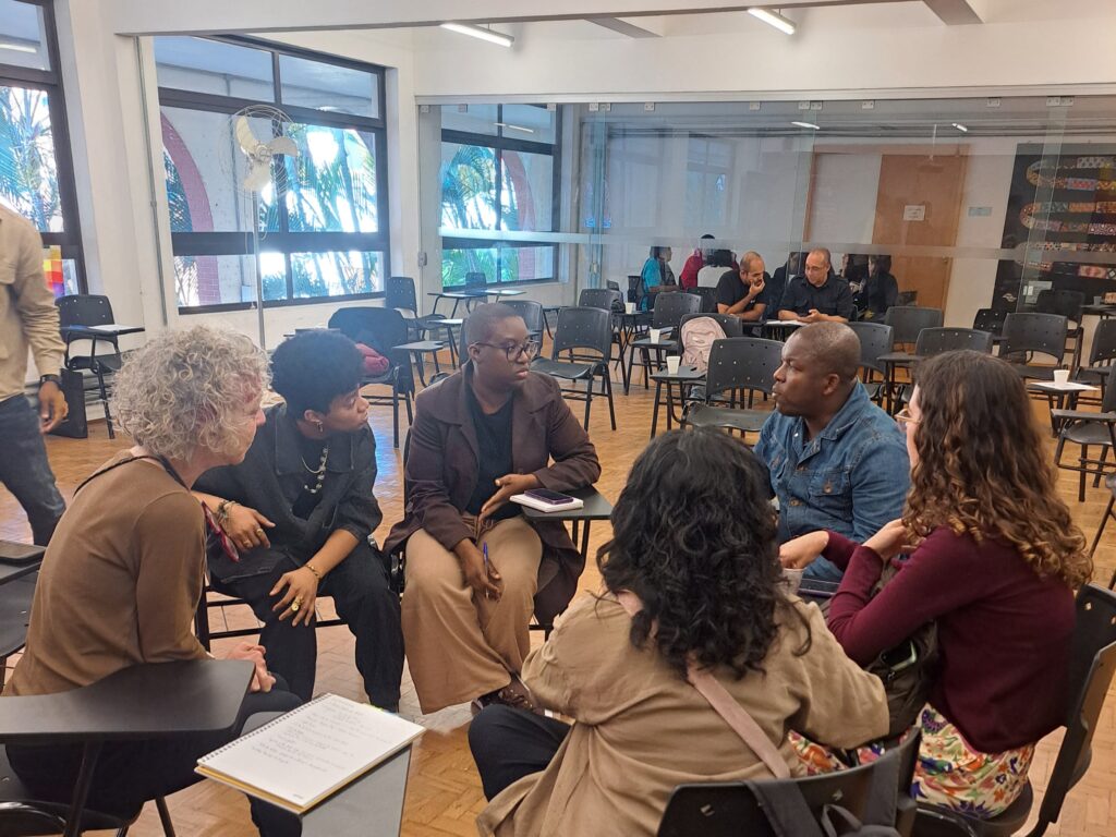Em seguida, nos dividimos em grupos para discutir caminhos concretos para fortalecer alianças e redes de apoio, com participação dos pesquisadores bolsistas das associações: USIH, Associação de Mulheres Imigrantes Luz e Vida (AMILV) – Yolanda e Miriam (Bolívia), Espaço Wema – gastronomia e cultura africana (Hortense Mbuyi, RDC), Centro Cultural Andino Amazônico (CCAA), Juan Cusicanki (Bolívia).