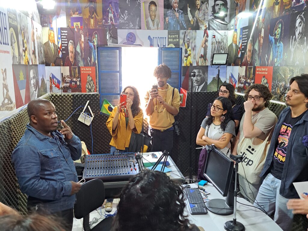 Começamos o percurso da oficina com visita guiada na União Social dos Imigrantes Haitianos (USIH), com Fedo Bacourt, fundador da associação e um dos pesquisadores bolsistas do Fronteiras Cruzadas. Os/as participantes conheceram a Rádio Citadelle, que faz parte da associação e é um lugar de produção e divulgação da cultura haitiana.
