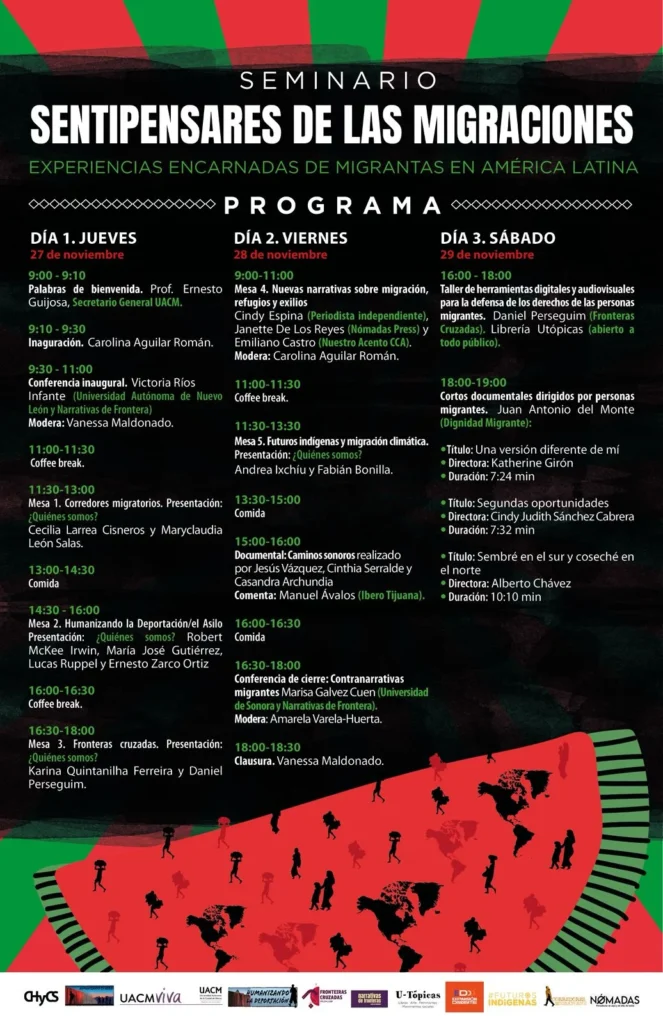 El programa completo del seminario, que incluye cinco mesas de análisis, talleres y proyecciones, se desarrollará durante los días 28 y 29 de noviembre. Las sesiones posteriores abordaran una gama más amplia de temas, como los futuros indígenas y la migración climática, las nuevas narrativas sobre el exilio y un taller práctico de herramientas digitales para la defensa de los derechos migrantes.